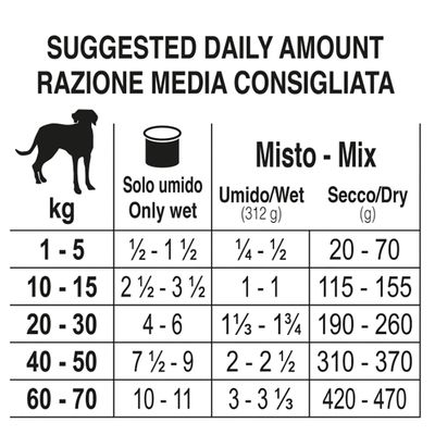 | Gewicht des Hundes | Dose pro Tag | Nassfutter (Dosen) + Trockenfutter pro Tag | |