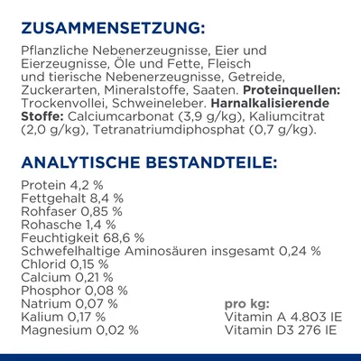 Pflanzliche Nebenerzeugnisse, Eier und Eiererzeugnisse, Öle und Fette, Fleisch und tierische Nebenerzeugnisse, Getreide, Zuckerarten, Mineralstoffe, Saaten. Proteinquellen: Trockenvollei, Schweineleber. Harnalkalisierende Stoffe: Calciumcarbonat (3,9 g/kg), Kaliumcitrat (2,0 g/kg), Tetranatriumdiphosphat (0,7 g/kg).